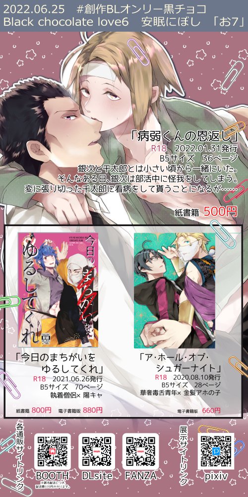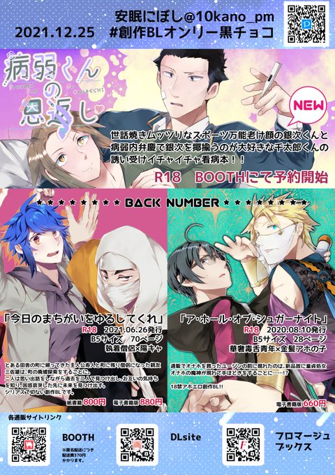 12月25日(土)に開催される #創作BLオンリー黒チョコ のお品書きです。 スペース:チョコお4 安眠にぼし pixivのサンプルやモーメントまとめの展示もしております。 予約本サンプル: pixiv.net/artworks/94684… モーメント: twitter.com/i/events/14203… #創作BLオンリー黒チョコお品書き