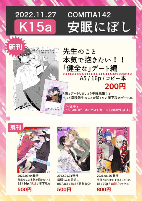 [お知らせ] 来る11月27日(日)開催のCOMITIA142のお品書きです! 年下攻め創作BLの新刊があります。(ポストカード付き) K15aでお待ちしております。 #COMITIA142 #コミティア142