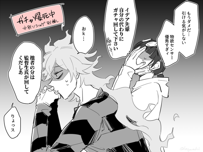 #twstプラス うちのイデ監の💀と監。顔ありだけど顔は出てない。 物欲センサーに勝てるのは無欲しかないので最終的に⚔️先輩にお願いしにいく(そして単発で引く)(崇める)
