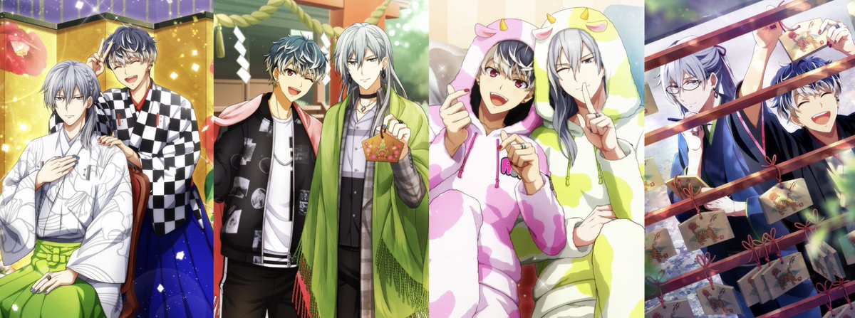 Re:vale正月UR、毎年イチャイチャ度が上がってるのはさもありなんなのですが、2019年から並べたら2020年にユキが持ってる絵馬をモモと一緒に掛けに来る神社デートを見せびらかされるのが2022年なのめちゃくちゃテンション上がってしまった 「「「繋がってる」」」ってことじゃん………………