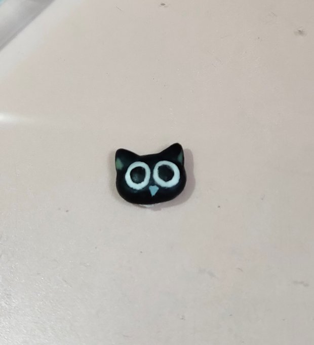先日ダイソーのモールドで衝動的に作った使い道のないレジンの小黒、ダイソーのスチールワッシャー貼ってネオジム磁石組み合わせるとピンズ的に使えるな…マスクアクセになるかな…? #羅小黒手芸部