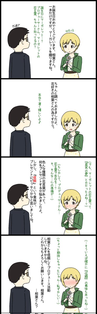 #相葉夕美 #相葉夕美生誕祭2022 #相葉夕美誕生祭2022 #デレマス #デレステ #アイドルマスターシンデレラガールズ 相葉さんお誕生日おめでとう四コマ漫画です。 ちなみに、一本のマーガレットをプレゼントすることには「あなたが運命の人」という意味があるそうです。