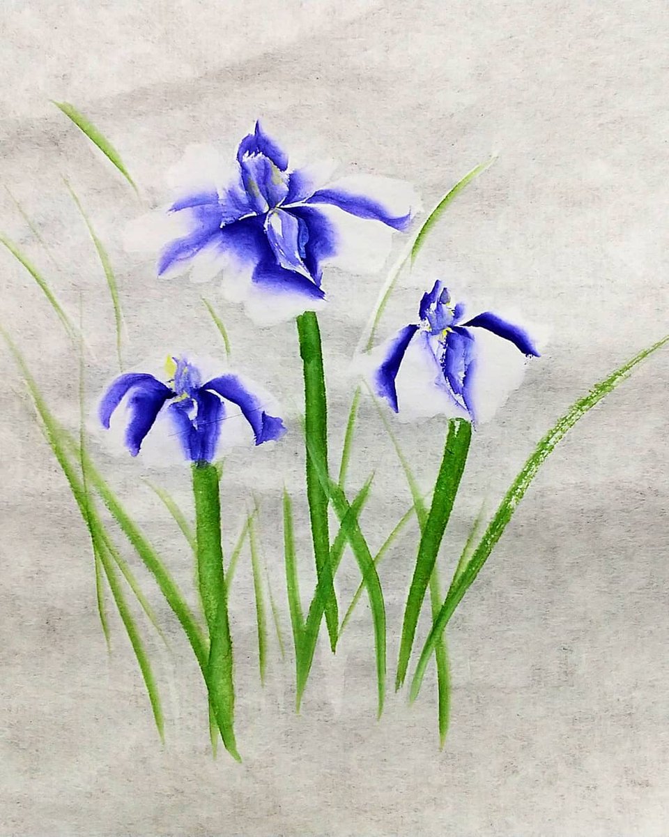 花菖蒲。 花弁は、 筆に胡粉(ごふん、白色)を含ませる。 ↓ 筆先に紫を融合させる。 ↓ 筆を横にして側面で描く。 すると、グラデーションが出現します。 #絵 #イラスト