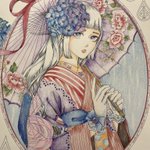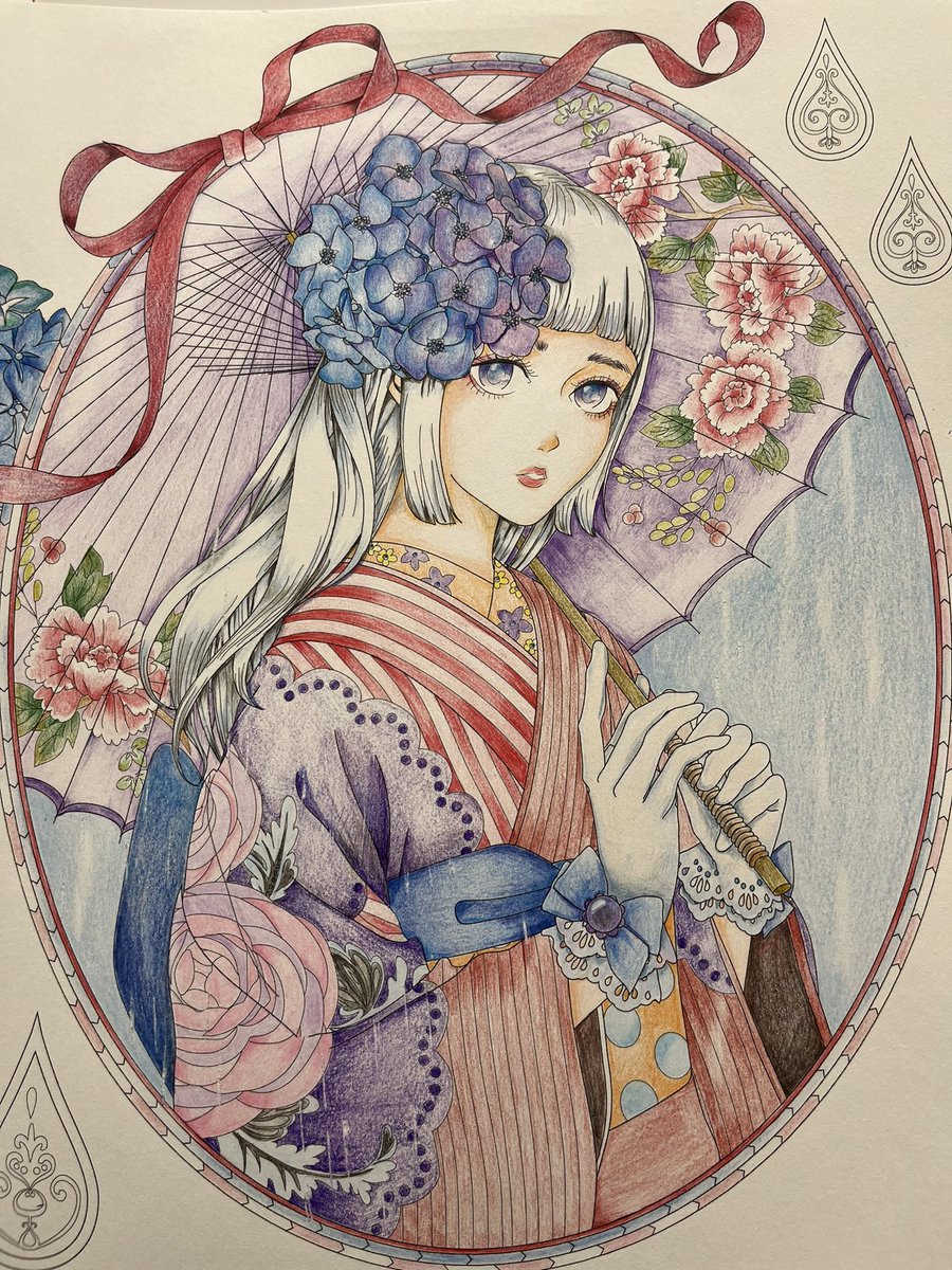 4 73 私の塗り絵はいつも薄すぎる、と旦那に言われたので、私好みの淡い色も重ねぬりも封印して、力の限り濃い塗り方でやってみました。着物楽しい #乙女と猫の物語 #大人の塗り絵 #色鉛筆 #ぬり絵 23/01/19 15:12