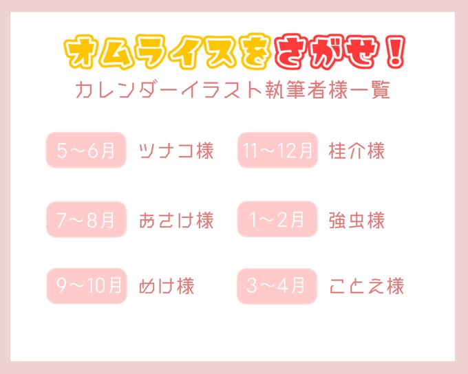 💎クイズ景品💎 本日はクイズ企画の景品のカレンダーイラスト執筆者様を発表致します! ツナコ様(@SSK_tenten) おさけ様(@mutairikunos) めけ様(@meke_oekaki) 桂介様(@s_al_mon) 強虫様(@t4m4_ni) ことえ様(@kotoechiquita)