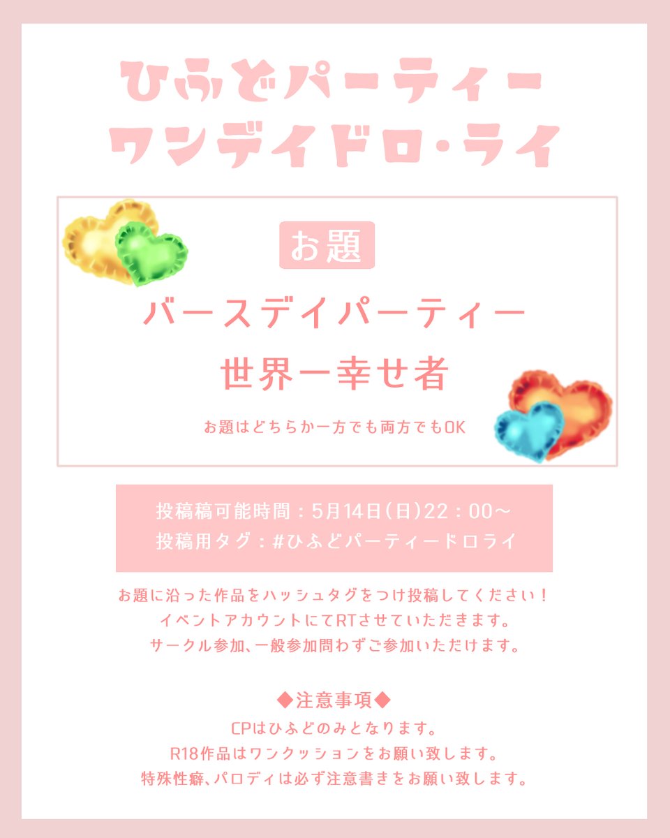 ✏️ワンデイドロライお題発表🖍️ ワンデイドロライの詳細になります! お題『バースデイパーティー』『世界一幸せ者』 指定の時間に #ひふどパーティードロライ のタグをつけ投稿してください。(他所で公開済みの作品はお控えください) どなたでもご参加いただけます。詳細は画像をご確認ください🔍