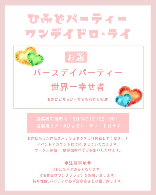 18 36 ✏️ワンデイドロライお題発表🖍️ ワンデイドロライの詳細になります! お題『バースデイパーティー』『世界一幸せ者』 指定の時間に #ひふどパーティードロライ のタグをつけ投稿してください。(他所で公開済みの作品はお控えください) どなたでもご参加いただけます。詳細は画像をご確認ください🔍 23/05/02 20:00