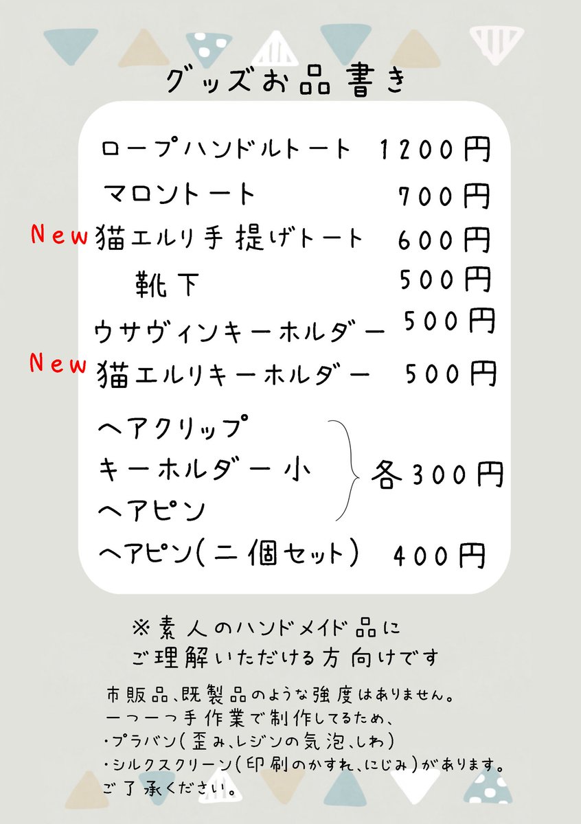 双翼14 お品書き | しおpixiv.net/artworks/10886… ■グッズについて■ 新しいもの以外はBOOTHをご参照ください。ミニトートとヘアゴム以外は大体持っていきます☺️新しいグッズの詳細写真は明日自然光で撮ってからツイートさせていただきます🙇♀️💦ギリギリですみません~~