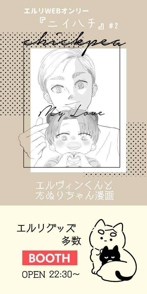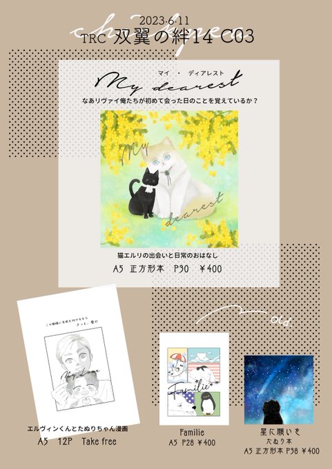 6/11双翼14新刊『My dearest』A5/正方形本/30ページ 猫エルリの出会いと日常のお話です。※長めのサンプルはしぶにアップしております。pixiv.net/artworks/10851… 双翼14はC03『chickpea』でスペースをいただきました。どうぞよろしくお願いいたします。