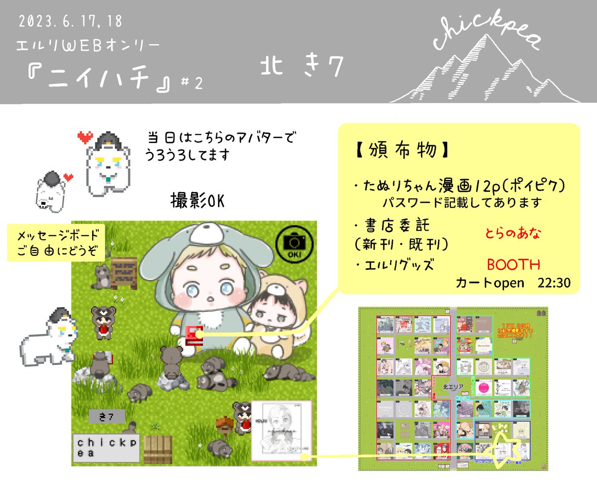 ニイハチ#02は【北き7】chickpeaでスペースをいただきました!ありがとうございます🙇♀️先日の双翼で頒布しましたたぬりちゃん漫画『My Love』pixiv.net/artworks/10878… の全文を展示&グッズの頒布を予定しております。グッズについて⇒⇒ #20230617_18_ニイハチ