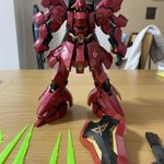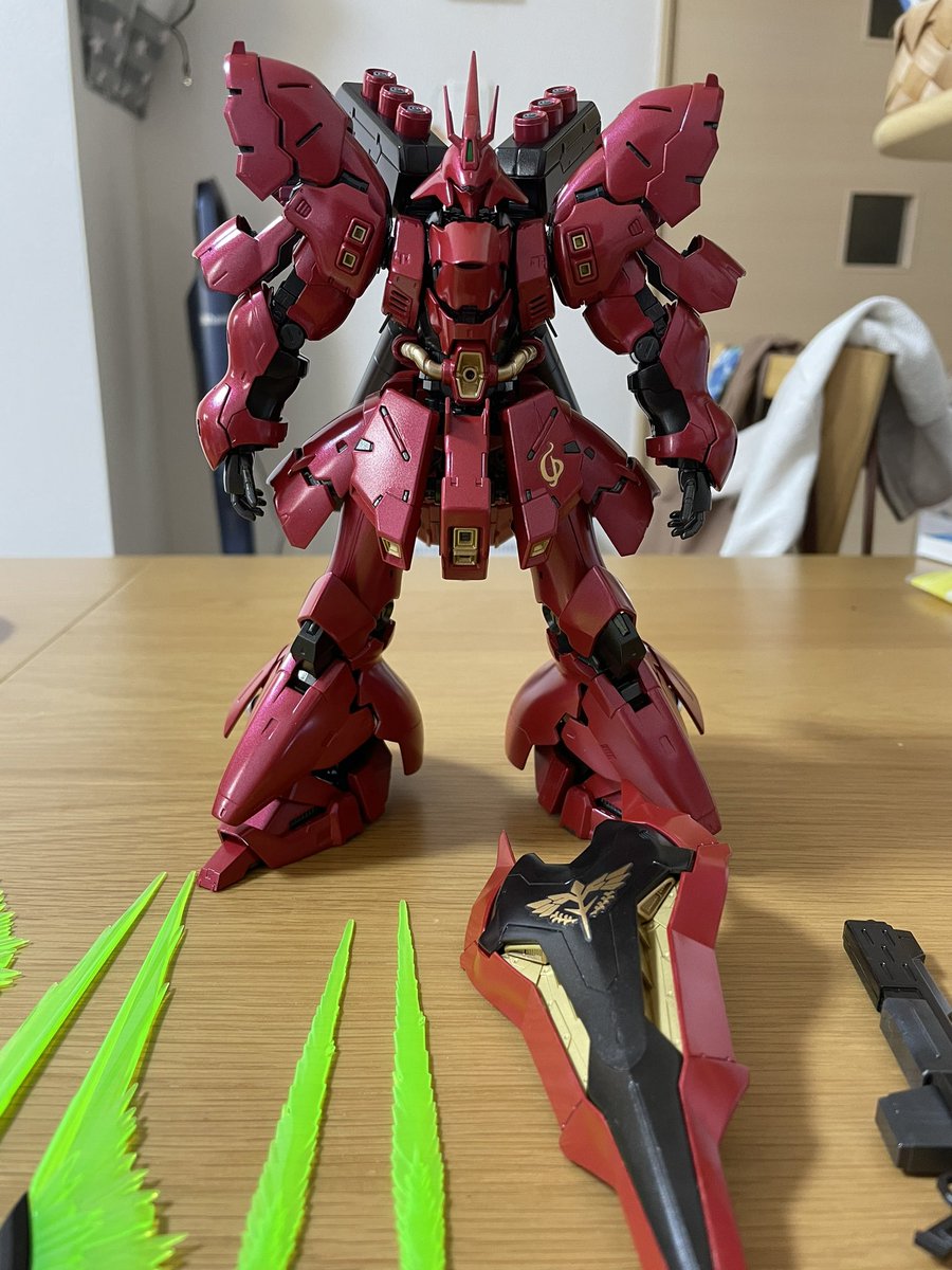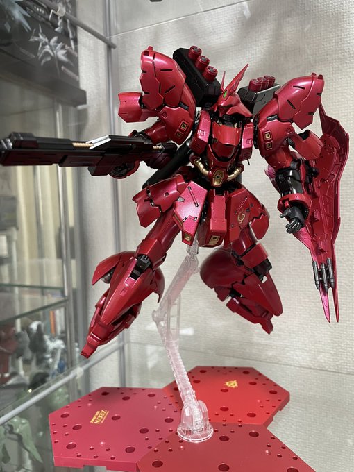 RGサザビー完成!!灰サフ→メタリックレッド→光沢クリアのテカテカ仕様です♪黒部分は青鉄色でこちらもテカテカ!シールドのゴールド塗り分けはお気に入りです⭐︎ #ガンプラの画像を貼るとRTされると聞いて #ガンプラ好きと繋がりたい #サザビー