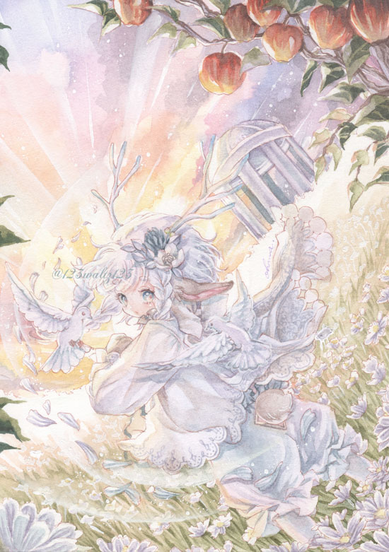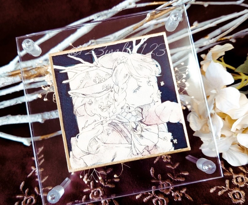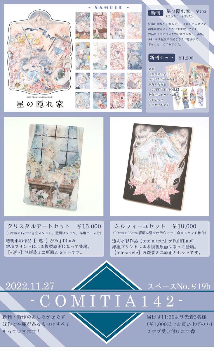 明日の #COMITIA141 の おしながきを上げるのが 夜になっちゃいそうなので 今のうちに明日の新作について 呟いておきます😌🌸 明日の新作は プリーメルの物語を再編& 新規作品を追加した画集と 画像の額装ドローイング、 八角額ミニ作品2点です✨ (続きます↓)