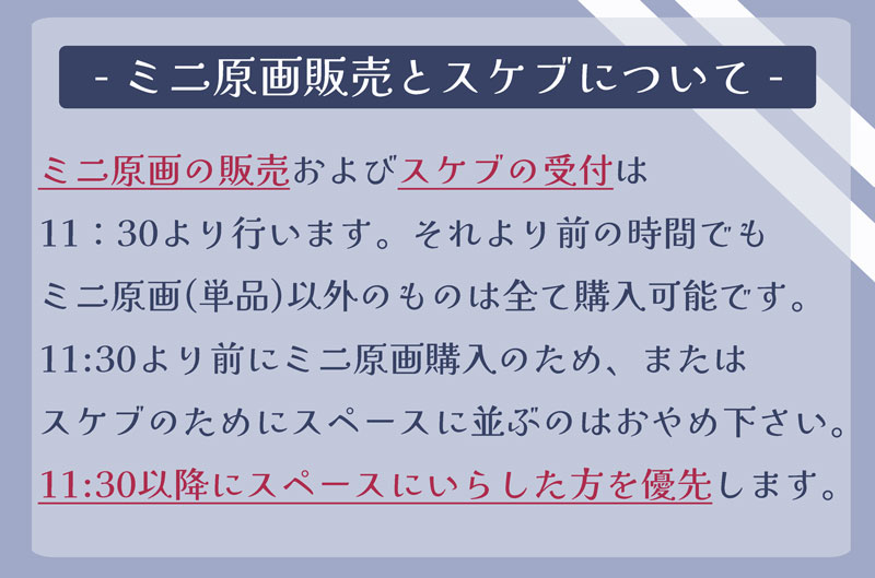【- おしらせ -】 明日(2022.11.27)に 東京ビッグサイトで開催される #コミティア142 に参加します🌷 当日持ち込むミニ原画のご紹介は 後ほどツリーに繋げます🤗✨ 【スペースNo.】ち19b 当日の注意事項なども 画像にまとめましたので 良ければご覧ください~🌟 #コミティアお品書き #COMITIA142