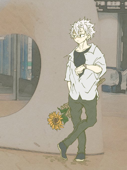 34 469 こないだでっかいお🌻花を持ったがいこくじんの👨を見かけてとてもステキだったというrkgk🍃さん 待ってるのはもちろん🌊さん (背🔙景は地元民しか知らないだろうまちあわせ場所の📸加工) 23/08/12 20:59