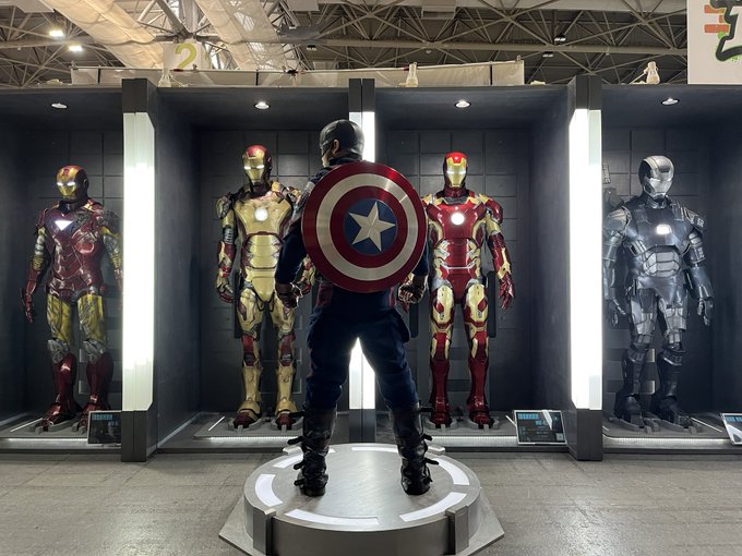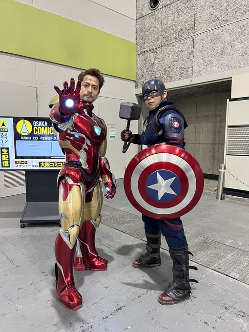 コミコンにて、キャップコスで絶対に撮りたいと思っていた写真が撮れました☺️ WSとironman3オマージュ✨ (数年前は陛下コスでご一緒してもらったアーマー達🐈⬛) EDGE中隊長さん、素晴らしいブースありがとうございました🙇♂️ 📸@spider_1218さん #大阪コミコン #大阪コミコンコスプレ