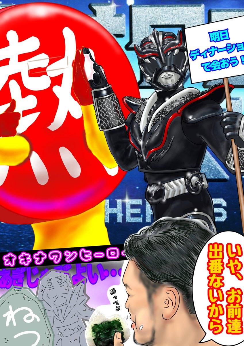 とうとう明日です✨ ディナーショーに始まり、フェスタ…果たしてどうなるのか‼️ ((o(´∀`)o))ワクワク 勢いに任せ #ブラックガナシー と #熱怪人 がフェスタ参加を諦めきれない様子を描いてみた(笑) いつか再び日の目を見れたらいいなぁ☺️ #オキナワンヒーローズフェスタ #リミカンイラスト課