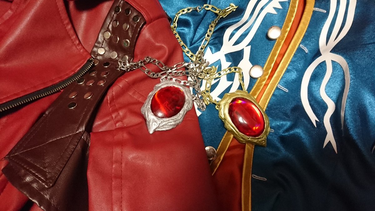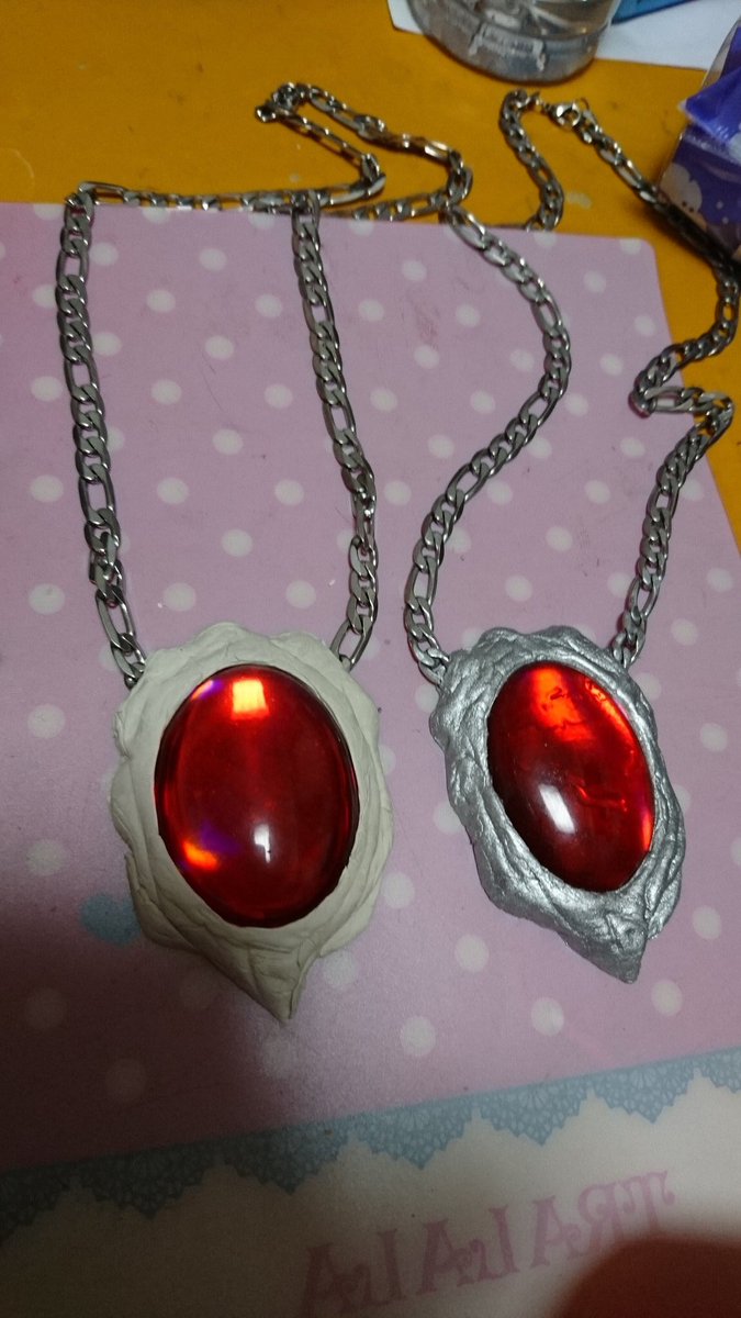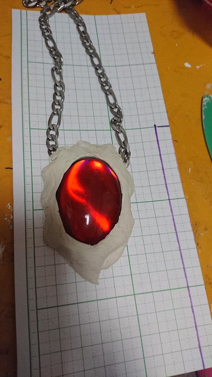#このタグを見た人はラフ造型とその完成品を見せる アミュレットは、業者製の見ながらファンド(造形用粘土)でクリスタルパーツの周りを形作って、チェーンを粘土に埋め込んで、乾いたら塗装って感じだった。