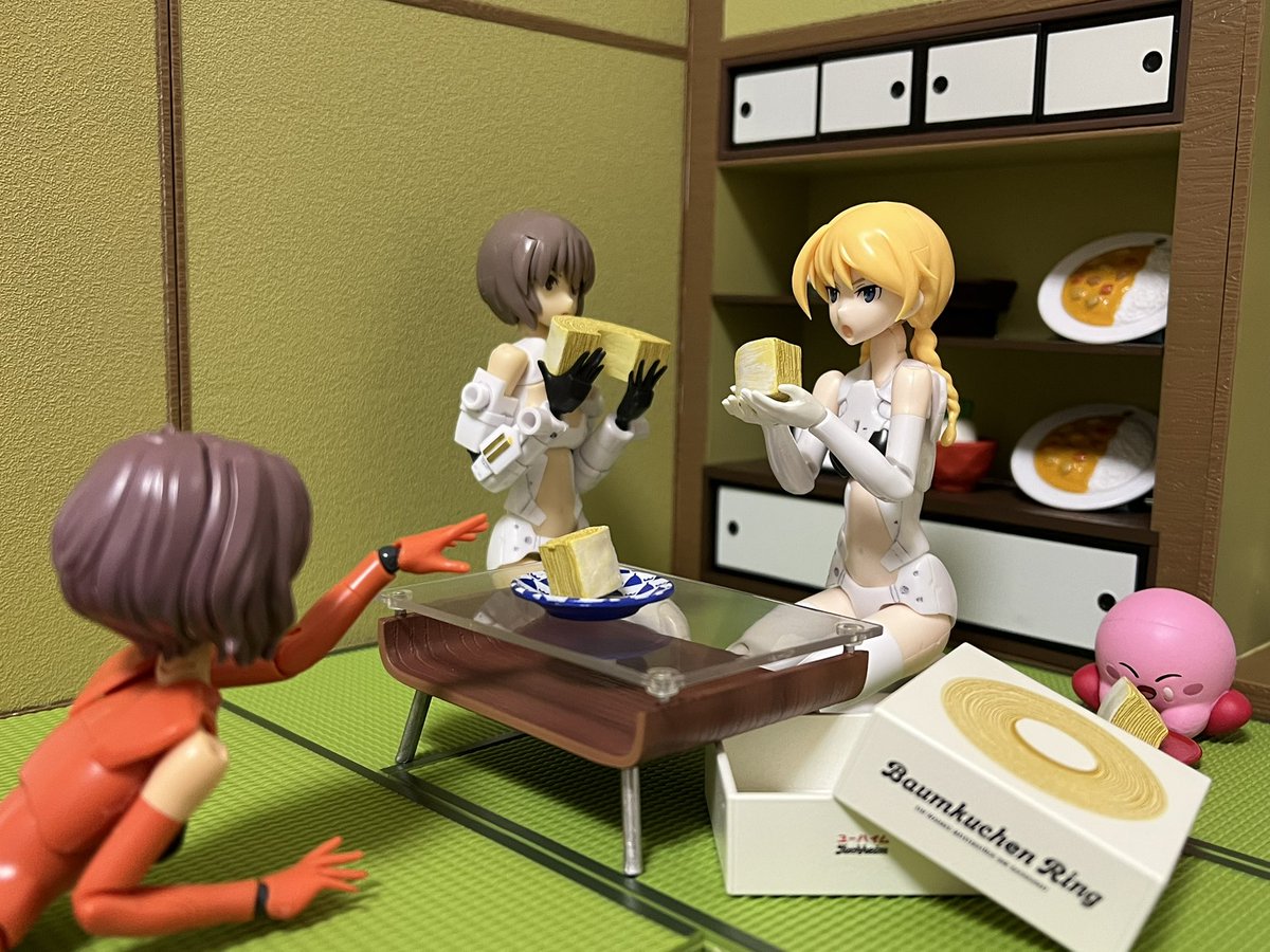 1 2 銘菓ミニチュアコレクション3 バウムクーヘンと陣太鼓は小物が多くて中々お得、後3つくらい欲しい #ガチャガチャ #メガミデバイス 22/11/13 23:41