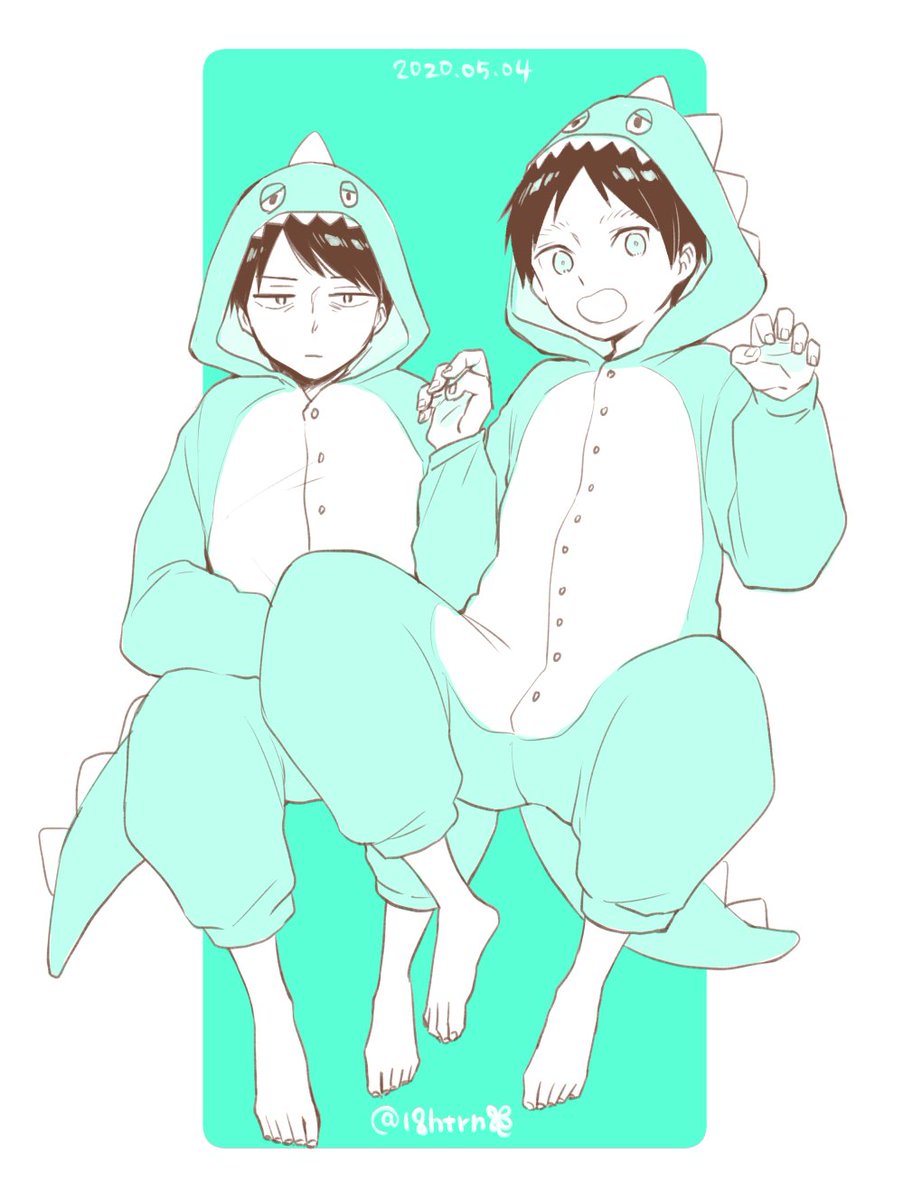 #エアスケブ 煌毅さん(@kouki518)へ 「恐竜パジャマのリヴァエレ」 大きい2人にガウガウさせてみました🦕🦖💕