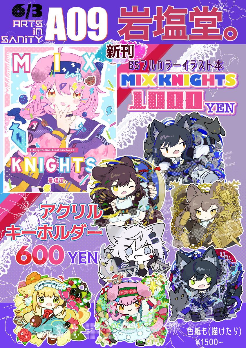 🌈宣伝タイム🌈 6/3(土) 横浜産貿ホール 「Arts in Sanity」 A09 岩塩堂。B5 / 16P イラスト本 「MIX KNIGHTS」表紙です⚡️デザインめっちゃかわい〜‼️ 過去のグッズ絵とからくがきとか詰めます🐱よしなに〜 #AIS_02