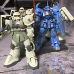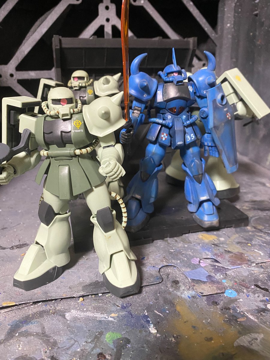 ジャンクザク3機とも、合わせ目消しの途中のもので、ランドセル、スカートのびらびら、肘、脛のアーマー、頭部、胸部、腿、大腿部、殆ど接着してあるじゃん。ってことで、久しぶりに成形色仕上げ決定。#ガンプラ好きな人と繋がりたい #ガンプラの画像貼るとRTされると聞いて