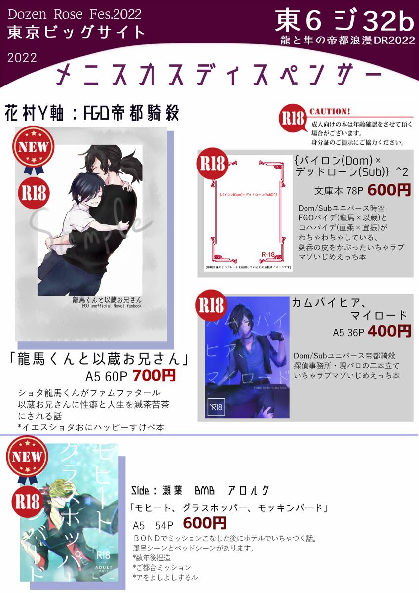 6/25のお品書き上げました! 全部年齢制限本なので年齢確認にご協力よろしくお願いします! #龍と隼の帝都浪漫JB2023 pixiv.net/artworks/10918…