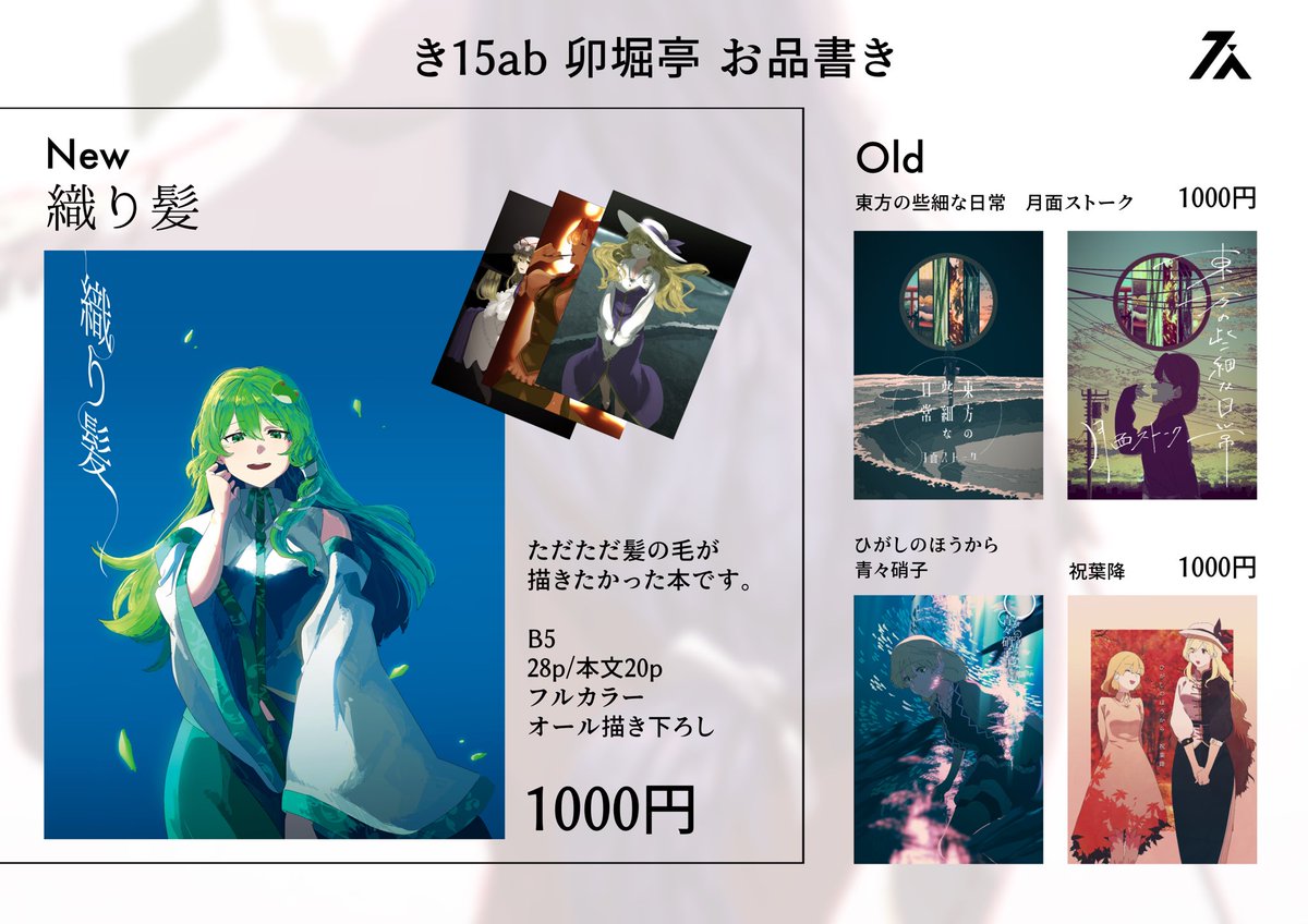 49 91 【5/7 博麗神社例大祭 き15ab お品書き】 新刊イラスト本とかなり前に出した映像作品のパッケージ版を少数持って行きます🖐️ かれこれ4年ぶりくらいの参加です、当日はよろしくお願いします🙇♀️ #例大祭20 23/05/06 15:54