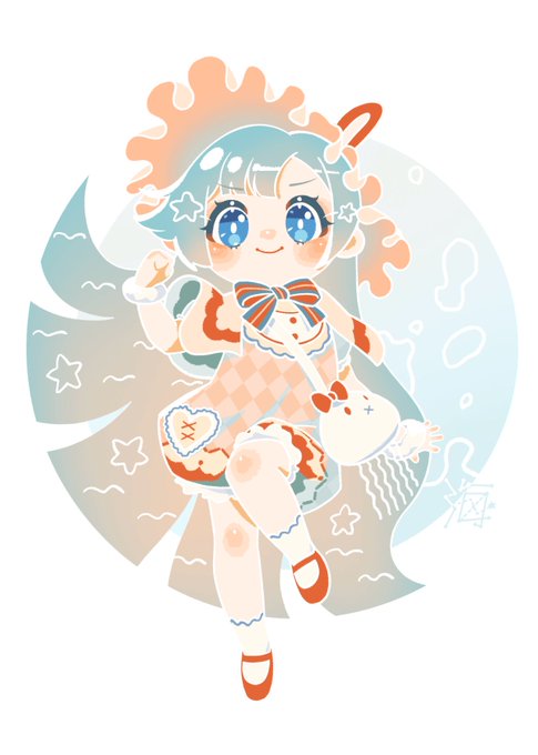 5 15 #今月描いた絵を晒そう 100日チャレンジの絵から ミラニキのコーデ🎠🦀、シャイニキの秦衣さん、創作の子、ゴルチャのジボムさんです 22/07/31 16:04