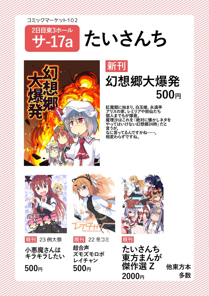 コミケ102新刊「幻想郷大爆発」 頒布スペースは「2日目(日曜)東3ホール サ17a たいさんち」 紅魔館に始まり白玉楼や永遠亭、アリスの家や個人までいろんなものが爆発する楽しいブックです。(爆発は楽しいので)