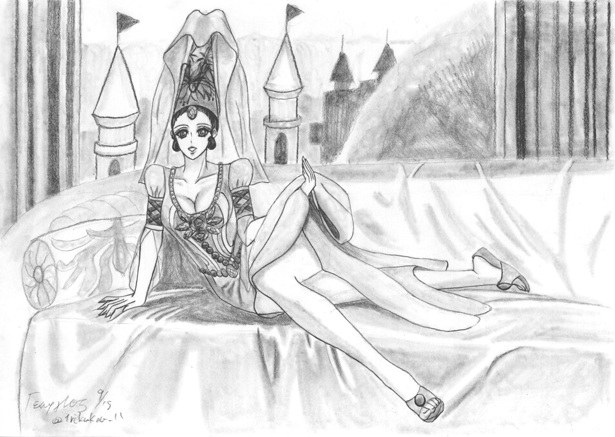 お疲れ様です😌。元絵から髪型、上部分、裾部分を想像で描いてみました😌。靴は、ガラスでなく宝石を切り出した靴にしてみました😌。相変わらずドレスネタは、無茶苦茶ですね😅。 #絵師さんと繋がりたい #イラスト好きさんと繋がりたい #王子様のプロポーズ #乙女ゲーム #鉛筆画