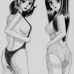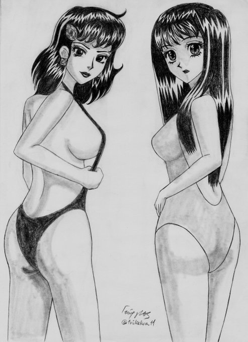 元絵を参考に描いてみました😌。作者さんの最近の画風で描いてみました😌。左の女性が「両さん+変身前の本田(原作では小泉今日子+浅香唯)」みたいで可哀想なので「美人とかわいい」に変えてみました😌。 #イラスト好きな人と繋がりたい #絵師さんと繋がりたい #水着女子