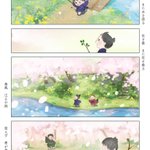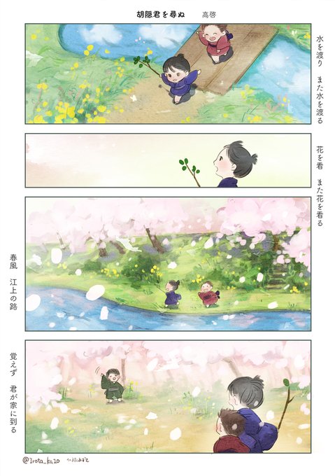 19 65 イメージ4コマ 尋胡隠君 高啓 渡水復渡水 看花還看花 春風江上路 不覚到君家 #漢詩 #漫画が読めるハッシュタグ #4コマ 23/03/24 19:56