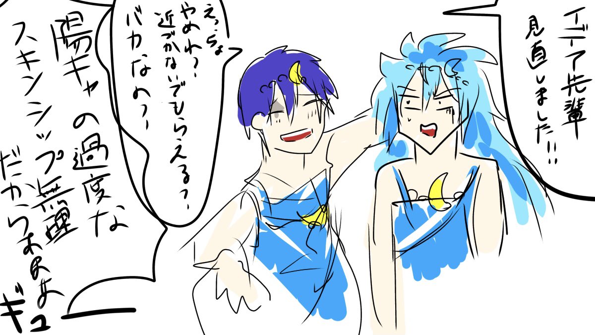 NRCの女装コンテスト 頭の弱いオクタを描きたかった。 ポムはやっぱり美しい枠で欲しかった。描いたのが5章がそもそも始まる前なんで、変なところがあったらごめんなさい。今みると多分エペ君はもっと嫌そうな顔するハズ…。 ※オクタとポムが女装している #twstファンアート