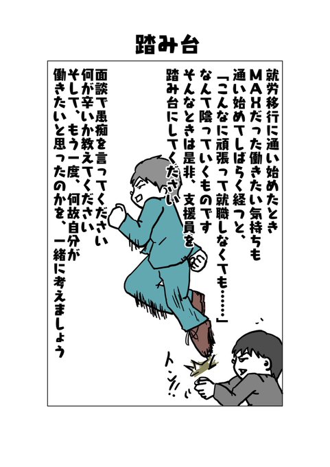 支援員は下がったやる気をまた上げるための踏み台でいいんです だから、利用者さんのやる気を下げる支援員はNGですよ #イラスト #福祉 #就労移行 #支援 #やる気スイッチ