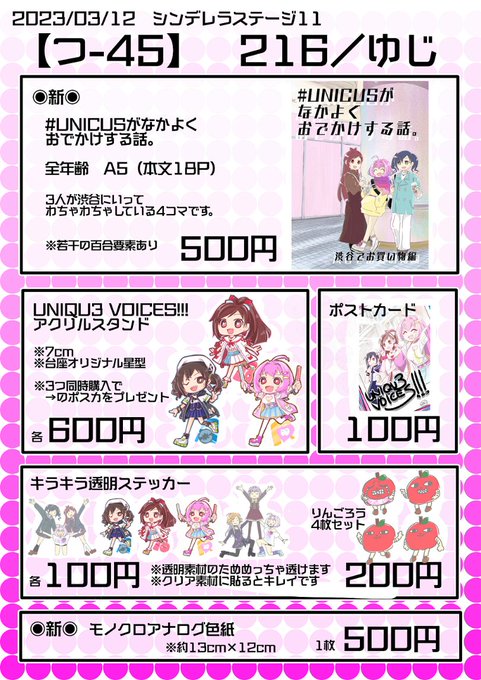 17 27 3/12にあるシンステ11のおしながきです。 新作はユニクス本と、SSR衣装で色紙を何枚かかいてもっていきます!(完成したのはツリーに載せていく) アクスタ、透明ステッカー、ポスカももっていくのでどうぞよろしくおねがいします🥳 #cin_stage #シンステ 23/03/08 20:04