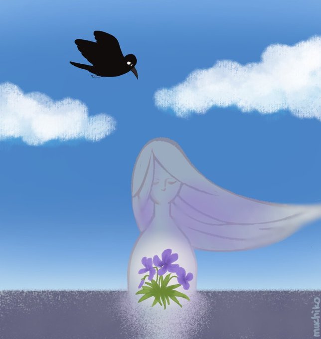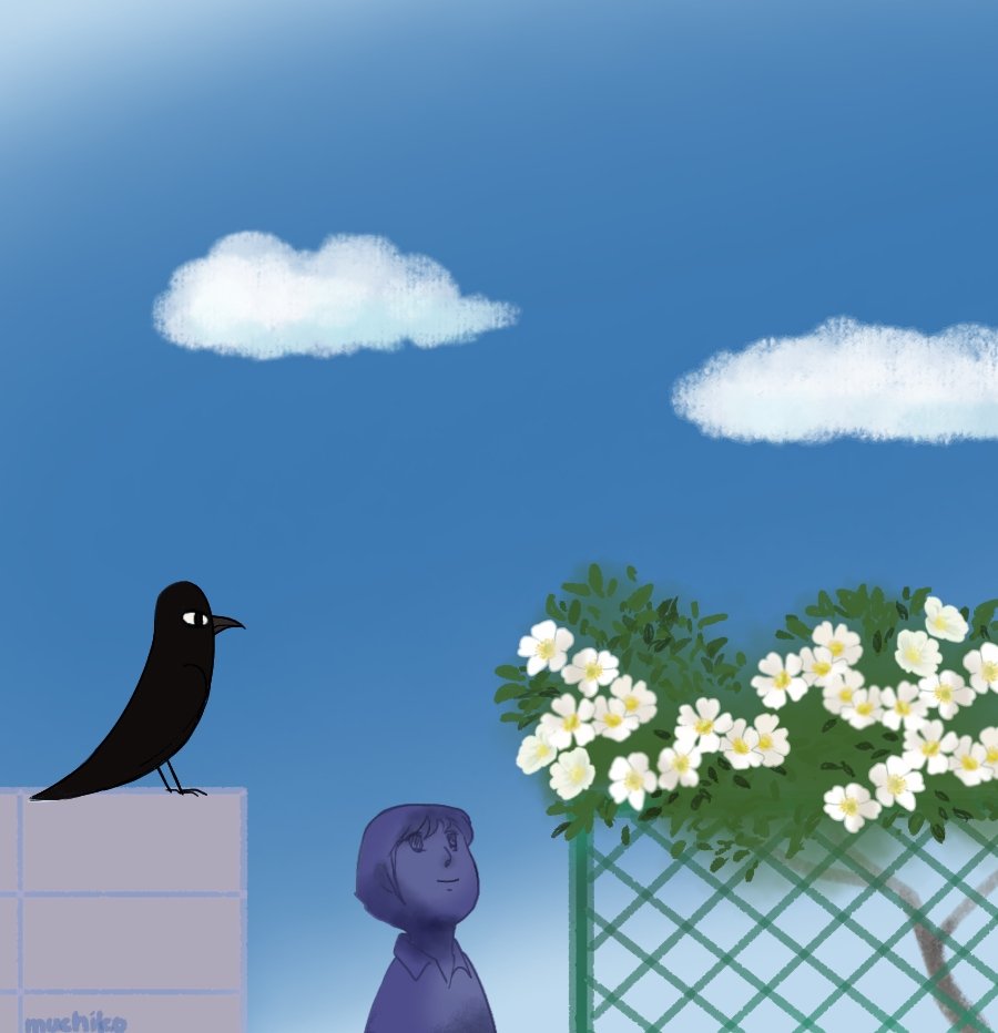 ひとえの白薔薇と青空カラス 薔薇の季節になりました。ひとえの薔薇を見ると大島弓子先生の「ローズティーセレモニー」とポール・エリュアールの「自由」という詩を思い出します。 #イラスト #イラスト好きな人と繋がりたい #薔薇 #大島弓子 #ポール・エリュアール