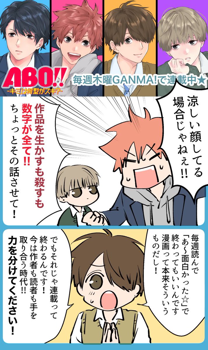 本日、最終話が配信されております~!よろしくお願いします🙏扉絵むぎゅって可愛くできた。 『ABO!! -キミは何型がスキ?-』の第1話を今すぐ読めます! - #ABO #GANMA! share.ganma.jp/magazines/abo