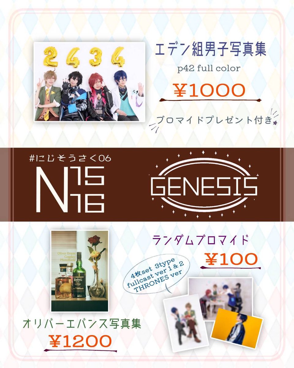 #にじそうさく06 のお品書きです! 工デン組男子の色んな衣装を収録した写真集、🍵の日常写真集、ブロマイドを頒布予定です✨ スペースはN-15.16のGENESISでお待ちしております✨ ハーフアニバのスカジャン衣装の男子勢コスで居るので暇してたら遊びに来てください😉👍