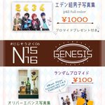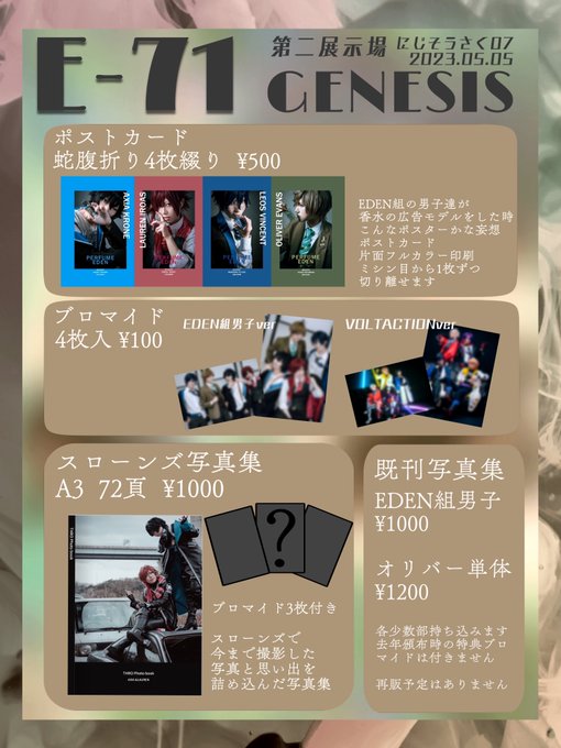 #にじそうさく07 お品書きです 【E-71】GENESIS ①ポストカード ②ブロマイド(ピンショットver、複数人ver) ③ス口一ンズ写真集 があります! 去年頒布した写真集の残りを見つけたので各3部ずつしかないけど持っていきます。