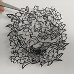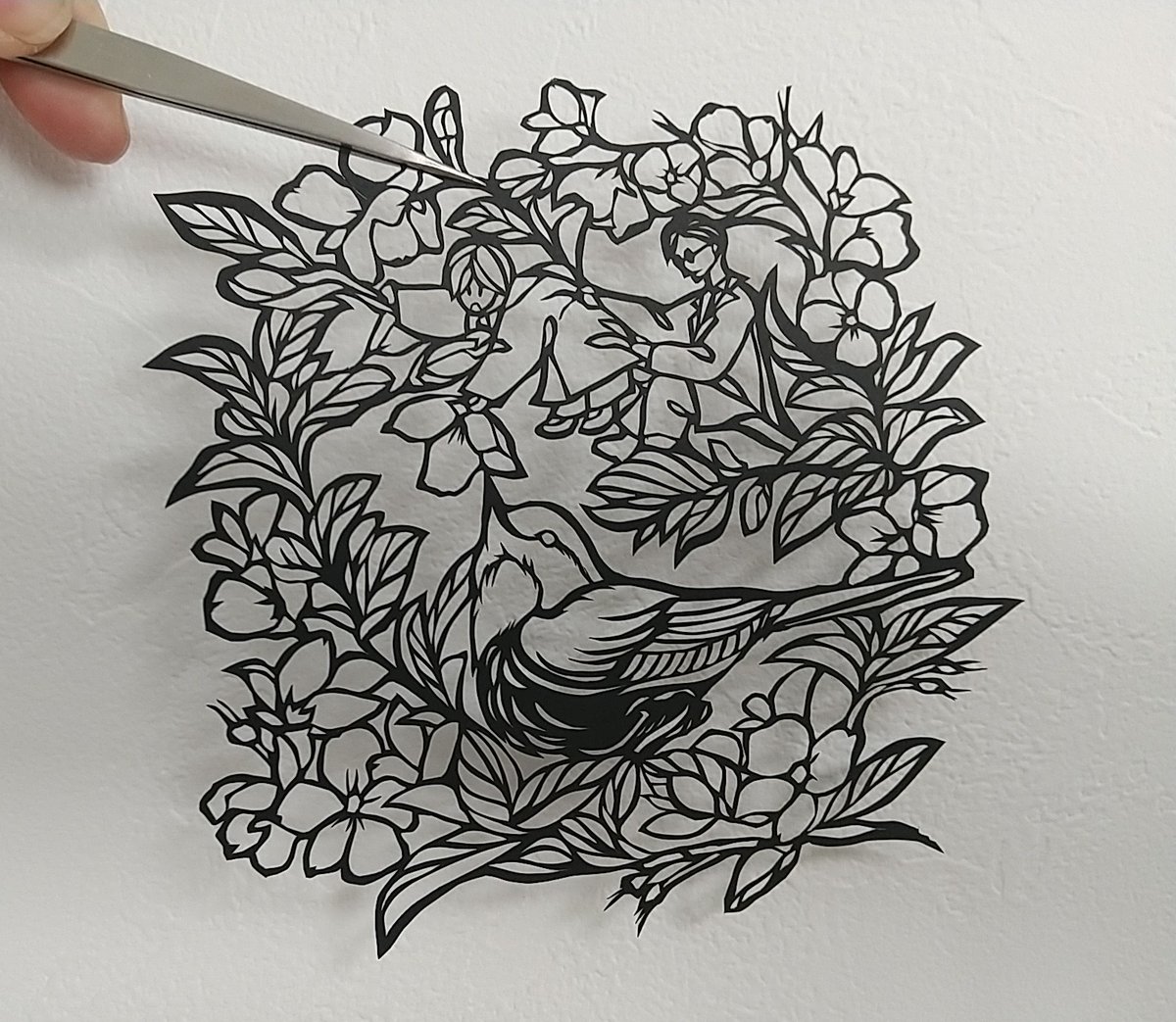 4月切り絵、小鳥と桜&小さな😈👼 切り5時間、色付けまた今度 #GoodOmensFanArt #切り絵