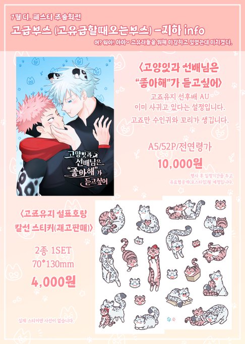RT🥰감사드립니다! 7월 디페스타 [고급부스~고유급할때오는부스~] 고죠유지 회지 및 굿즈 선입금폼 🐯선입금으로 구매해주시는 분들께는 설표호랭 조각스티커를 드립니다👍 선입금 기간: ~7월 14일까지 윗치폼: witchform.com/deposit_form.p… 회지샘플: posty.pe/nwiro7