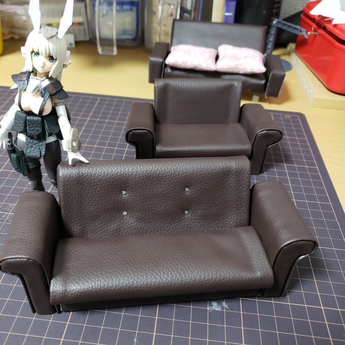 1 12 ソファーがで、できたがサイズへんだぞ まぉヨシ! #リボルテッククイーンズブレイド #メガミデバイス 22/02/18 01:15