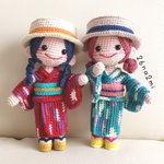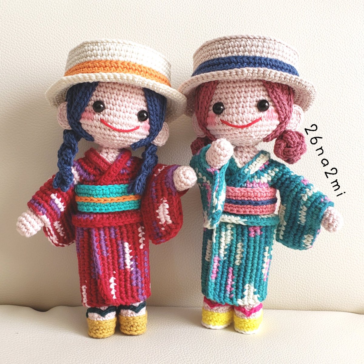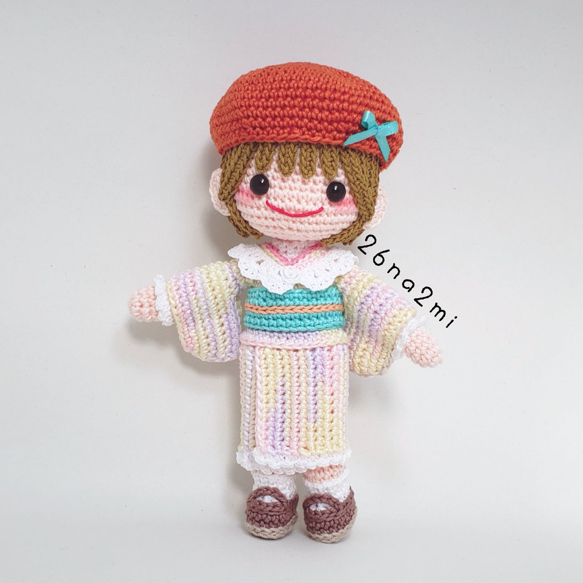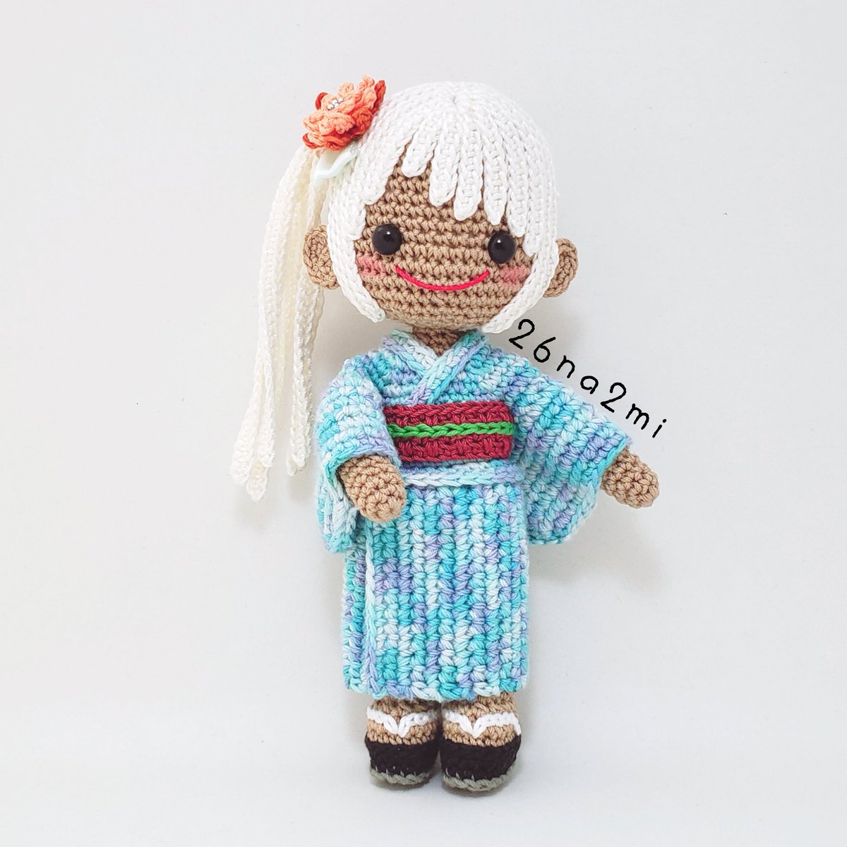 10 110 新作の和服っ子できました!着物の色が落ち着いてるから、渋くなりすぎないようにからし色の足袋とヒラヒラな帯結びで可愛らしさも取り入れてみました😊 #あみぐるみ #編み物 #なちょさん家 21/12/05 11:05