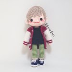 スタジャンの子を編みました!着丈長めでオーバーサイズ感出したかった!アシメ前髪もけっこう気に入ってる😆! #あみぐるみ #編み物 #なちょさん家