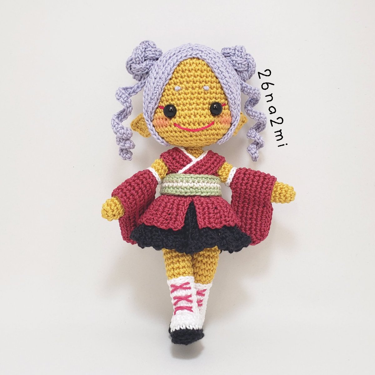 和風衣装な魔法使いの子を編みました!ずっとずーっと前から作りたかったモチーフなので完成させられて嬉しい!なんというか、この子はすごく“自分の作風”!!て気がしてる。 #あみぐるみ #編み物 #なちょさん家
