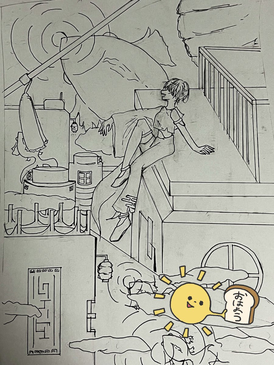 描き途中 何度も書き直しちゃってるぅ 服がぁむりさぁシワかけへんわい。あんま背景かかんしさ小さく人かかんからむずちぃ@AmaAma_0317 今日の夜で帰ってくるんだよね多分。( 亝👄亝)ウフフ💗嬉しいわ!( *¯ ꒳¯*)喜びの舞躍るべく学校のテンションがあたおかになっていますわw #イラスト #途中経過