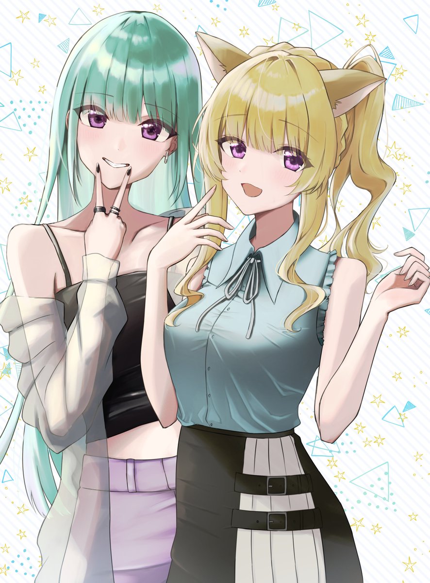 椿の勝手に2ショットFAのコーナー🐢③ 続いてのお相手は福喜多りぽ( @lipo21hp )さん🐈🍀 癒し系お姉さんの一面はもちろん最近では耐久配信をされていてバイタリティがすごい! 全力で好きな事を楽しんでいる姿を見ているといつも元気を貰えます! #りぽ絵 #つばきふゆ画 制作:二式ノ( @nogia_Ki ) 様