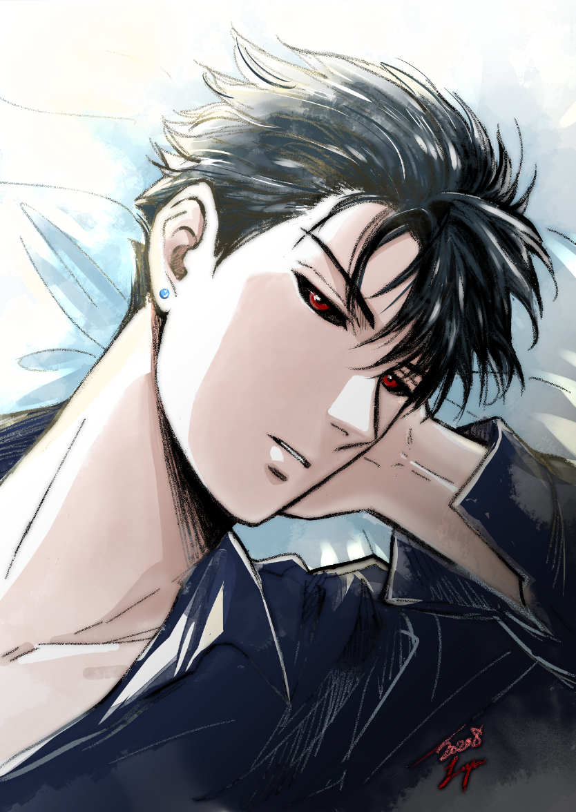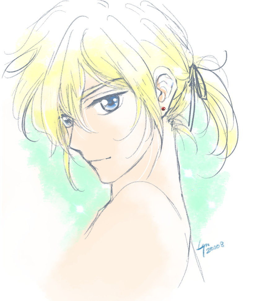 お互いの目の色のピアスをする島テル 落書きなんで塗りがちょー汚くて、島さんが余計黒くなって光と陰になった (休憩終わる)