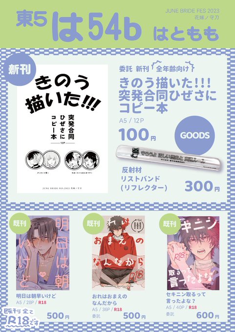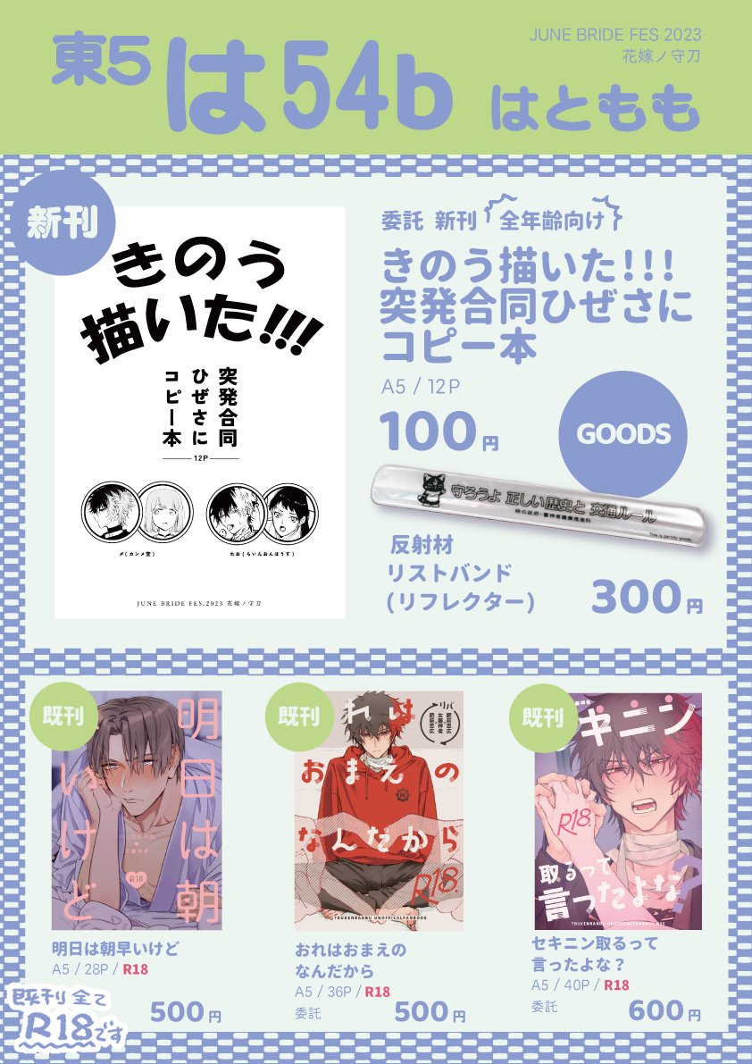 6/25 JUNE BRIDE FES 2023 花嫁ノ守刀 ジュンブラお品書きです! 新刊あります!委託の合同コピー本が出ます!!! 既刊とグッズもあります何事もなければ 東5 は54b 【はともも】です よろしくお願いします☔️ pixiv.net/artworks/10930…