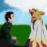 先日私が描いた煉獄さんの鉛筆模写を、中2のムスッメがタブレットで手直し&色塗りしてくれましたー🙌 #煉獄杏寿郎イラスト #無限列車編 #鬼滅の刃イラスト #模写 #母娘合作